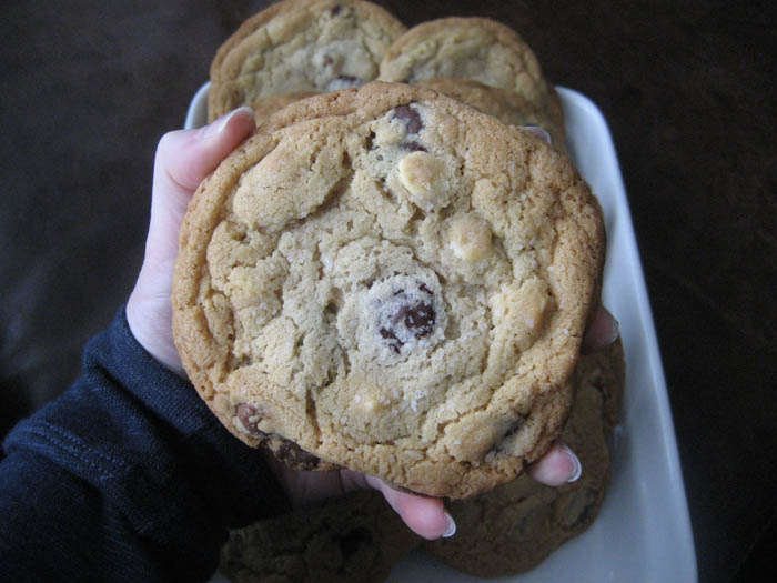 I usually have trouble with making GIANT cookies like these. They often spread too much, burn or don’t cook all the way through, but these turned out perfectly. They stayed round with a lovely golden edge and slightly underdone center. If Bob Ross baked, these would be his “happy trees” equivalent. In the land of cookiedom, these would be a gold standard stored in Fort Sugar.