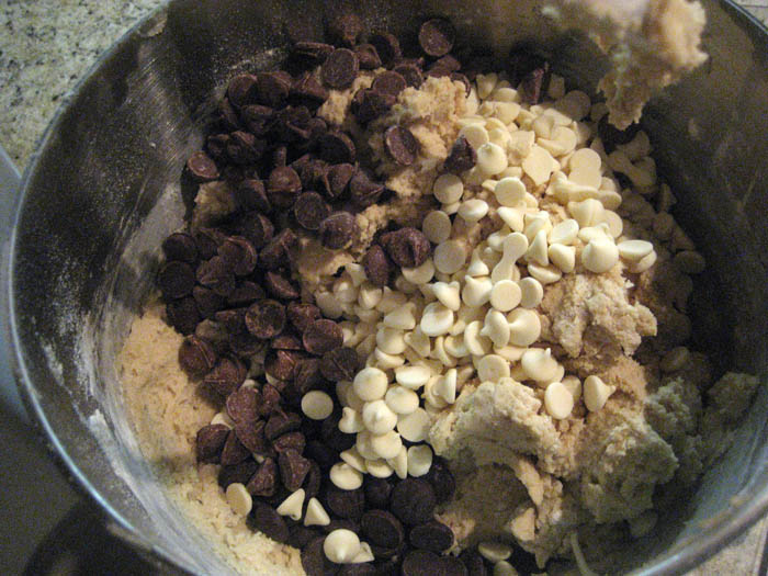 I am not a fan of nuts in my chocolate chip cookies, so of course I took the 1 cup that should have been nuts and redistributed amongst the chips, making it 1 1/4 cup of semi sweet, 1 cup milk and 1 cup white chips.