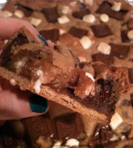I spent quite a while trying to find the perfect s’more cookie recipe and this is the winner. It has the perfect ratio of graham to chocolate to marshmallow, the marshmallows don’t burn, it has both dark and milk chocolate and the cookie dough itself is so good, that I’ve tried making them as straight up chocolate chip cookies (oddly, not that awesome – stick with the s’more cookie bars).