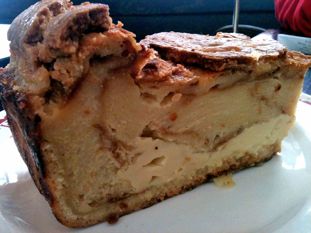 But one bite – and the world stopped. It was the very best things about vanilla – the middle of a Boston cream pie, real vanilla bean ice cream, the inside of an éclair, fresh whipped cream – all encased in a cool, soft but firm, gigantic slice of bread pudding. It was then that it occurred to me why I never like this style of bread pudding before: all the other attempts were failures because I could taste the eggs, where as this bread pudding tasted like vanilla custard. This bread pudding was also unique because it had an almost pie-crust like top and bottom.