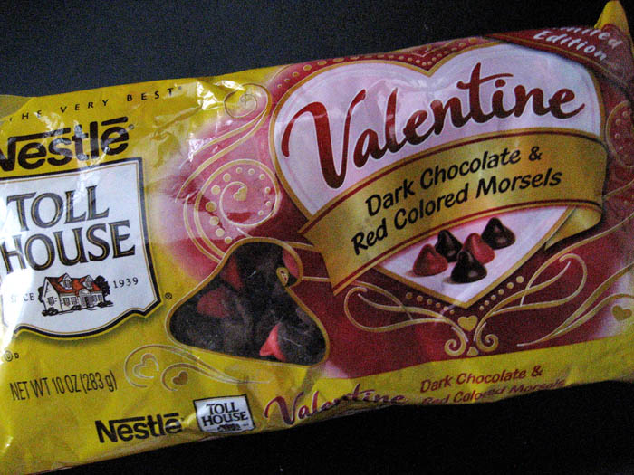 Some interesting things happened whilst I was shopping for ingredients to make these cookies, and yes, I just channeled my inner Shakespeare and busted out a “whilst” on you — love must be in the air. First of all, I found Nestle Valentine’s Semi Sweet Chocolate Chips. They’re regular semi-sweet chips mixed with red chips (a.k.a. white chocolate chips colored red). Duh! I didn’t hesitate grabbing these to use for my cookies.