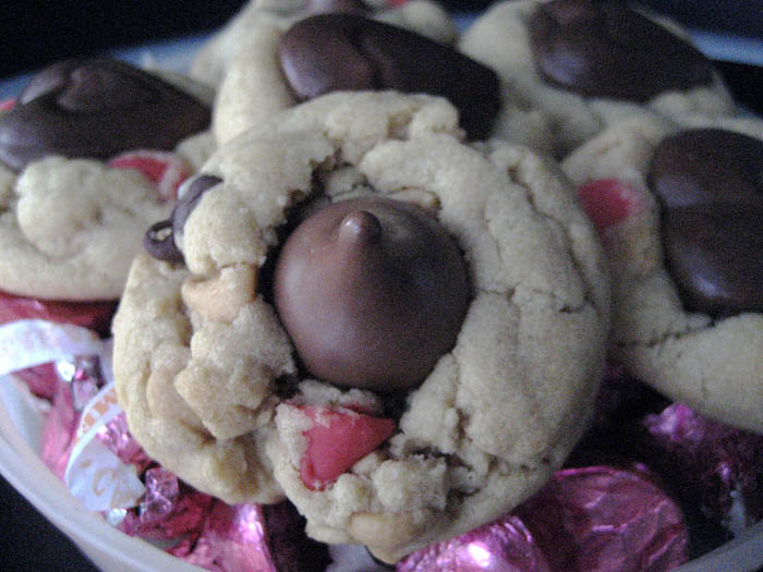 These cookies are very similar to your basic peanut butter blossom cookie (which is always inferior to my peanut butter cup cookies, fyi). You bake up the peanut butter cookies and then smush a heart or kiss in the top while they’re still warm. If you’re using the hearts, I recommend freezing them first; they’ll hold their heart shape better after you press them into the warm cookies.