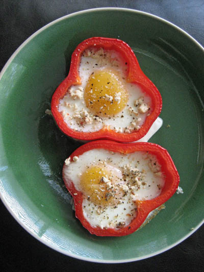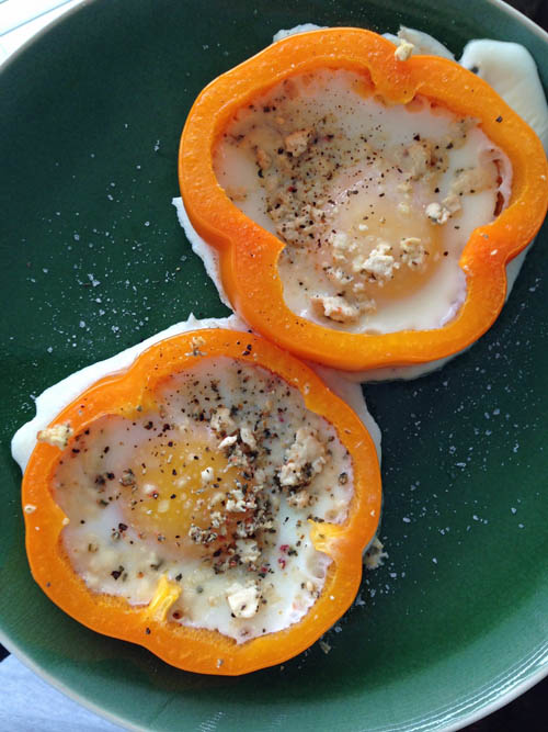Look at those colorful, googly eyes of protein! Get some veggies for breakfast by baking your eggs inside of pepper rings. Make sure to line the baking sheet with parchment paper and to cut the rings thick enough to hold the egg. Don’t worry if a little egg white starts to leak out the bottom, it happens. I bake mine for 8 minutes at 375 degrees, then sprinkles with tomato basil feta cheese after I pull them out of the oven.