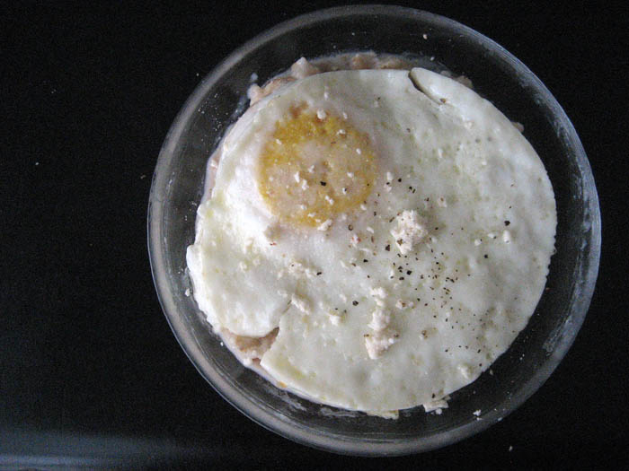 Okay, hang with me here, I know it sounds weird, but if a savory scone or pancake can be good, so can savory oatmeal. I prepare the oatmeal plain, in the microwave, while I fry an egg on the stove. I use a circular cookie cutter to keep it round. When the oatmeal is cooked I mix in some walnuts and the tomato basil feta, then top with the egg and a little more feta, salt and pepper.