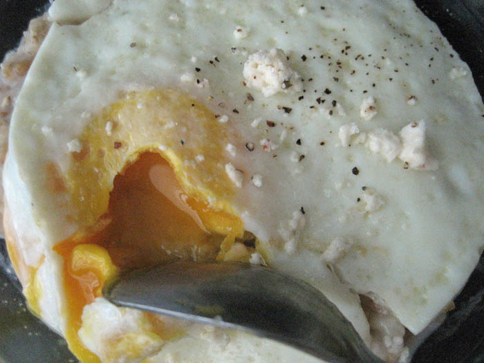 Now if you want to step up the difficulty scale, you go with the poached egg. I’m not going to detail how to poach an egg here, because I’m still trying to master it myself, but I will tell you they go great over leftover vegetables from dinner the night before.