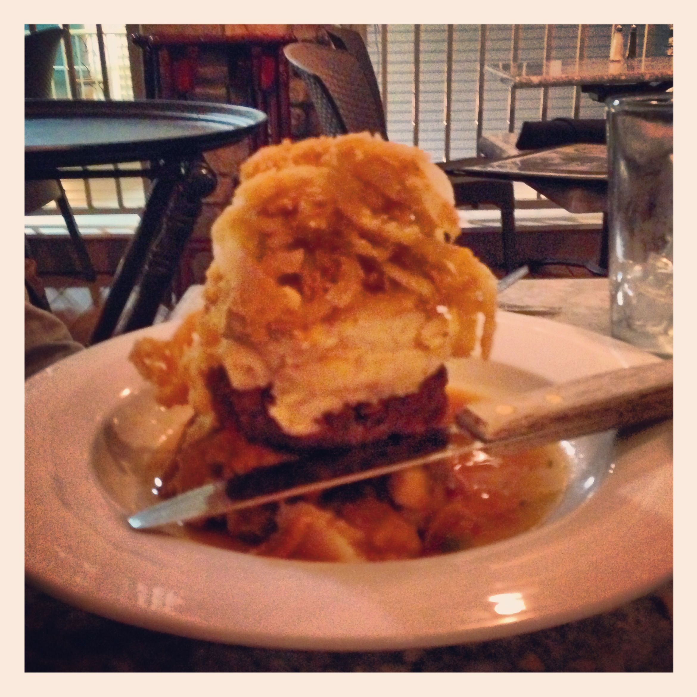 Including meatloaf, topped with mashed potatoes and onion rings.
