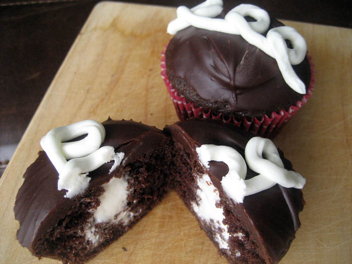 Ok, actually I lied, the annoying part is the chocolate icing. When I dipped these in the warm chocolate icing, it sometimes sucked the marshmallow filling out of the top as I pulled the cupcake out and then I’d have a little white tie-dye effect on top or even some filling floating in my pot of chocolate icing. Perhaps I overfilled my cupcakes? Used too shallow of a pot? Either way, I ended up using a spoon to pour the icing over the top of the cupcake and smoothing it with the back of the spoon. This icing smooths over nicely, so don’t be afraid to make touchups.