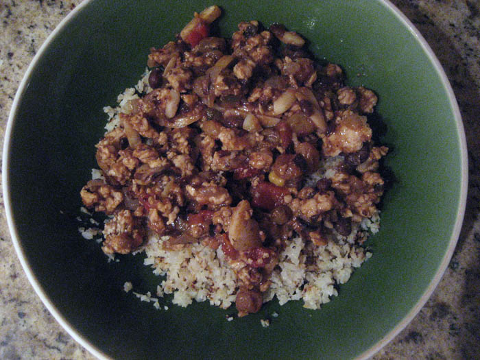 I realize with the cauliflower rice it gets a little monochromatic. It looks prettier on a bed of leafy greens with some Queso Fresco on top does it not?