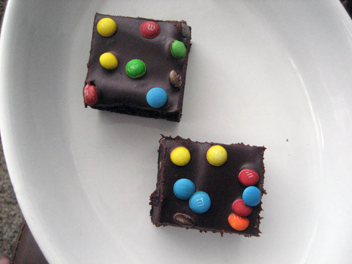 Evenly sprinkle with M&Ms or sprinkles. Cover pan with foil or plastic wrap and place in refrigerator until ganache sets up before slicing and serving, at least 2 hours. Do not slice into them until the ganache has set. I made mine the night before and sliced in the AM before packing to take to a tailgate. I do prefer these when the ganache is a bit chilled as opposed to room temperature.