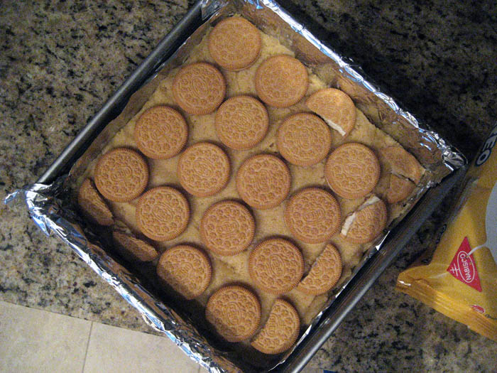 Press the cookie dough into the bottom of a 9×9 baking pan. Place a single layer of Oreos on top of the cookie dough. The blondie brownie batter is thick, so do your best to get between the cookies and smooth the top.